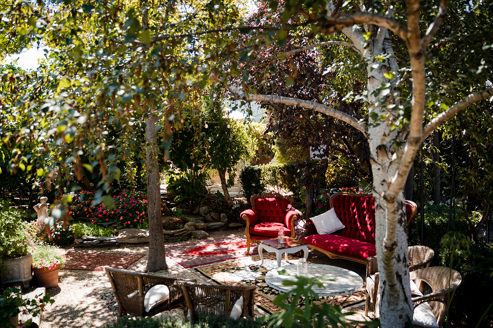 The layered garden provides many different intimate spaces for guests to mingle and for various seating options. The covered verandah of the old stone cottage has a beautiful view of the garden and is the perfect backdrop for a feasting station or rustic photo booth, with space for additional mixed seating.