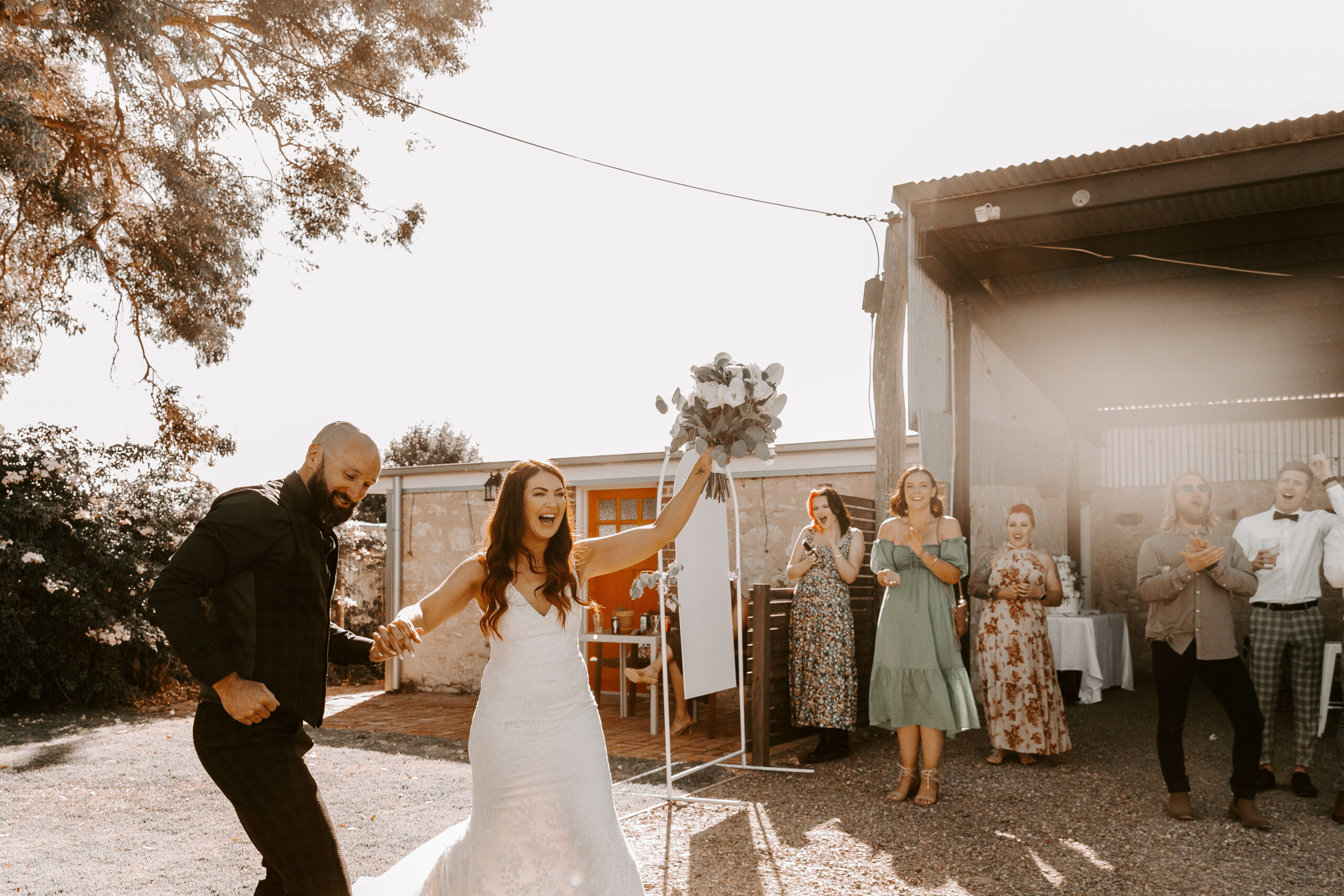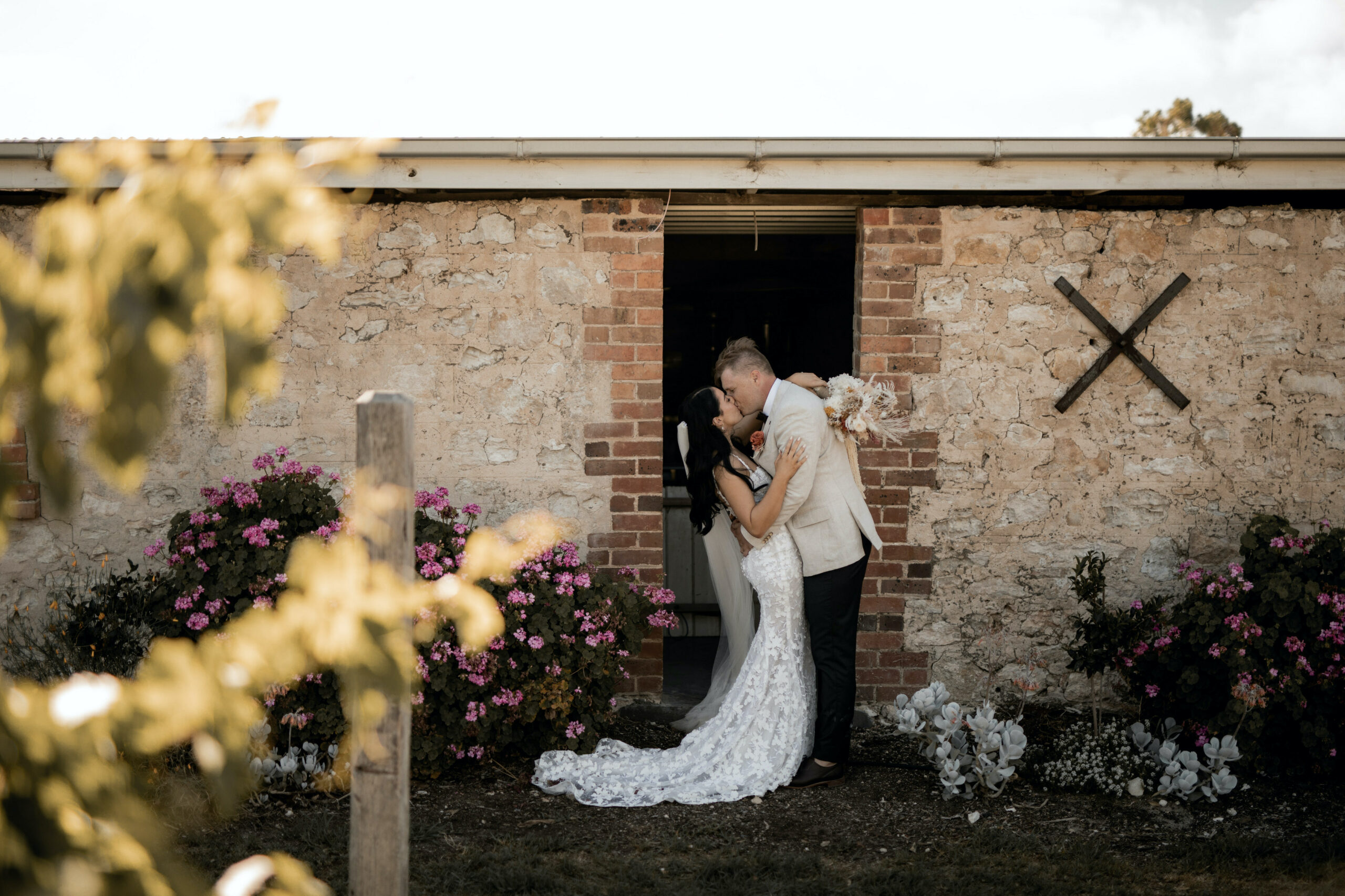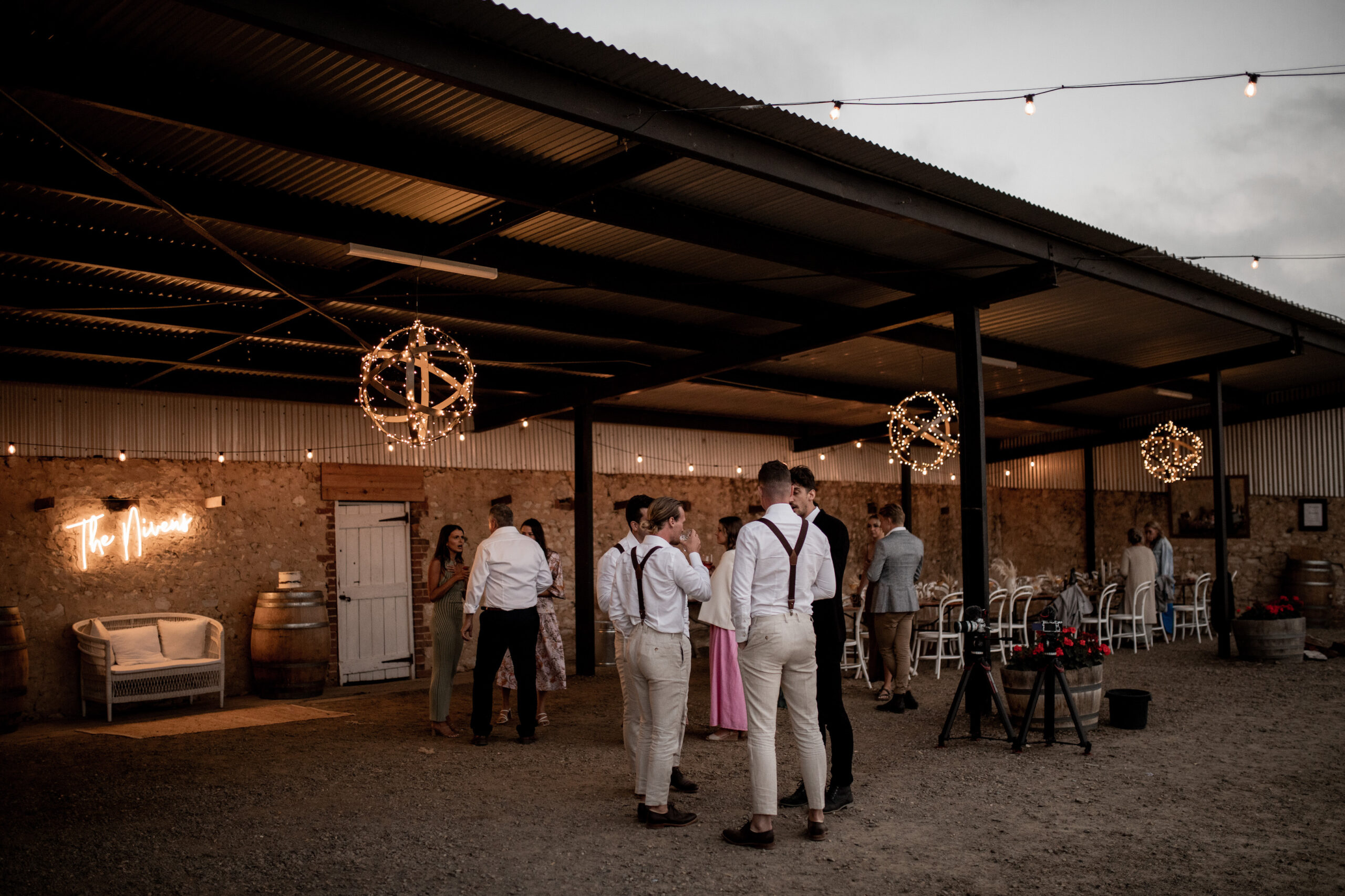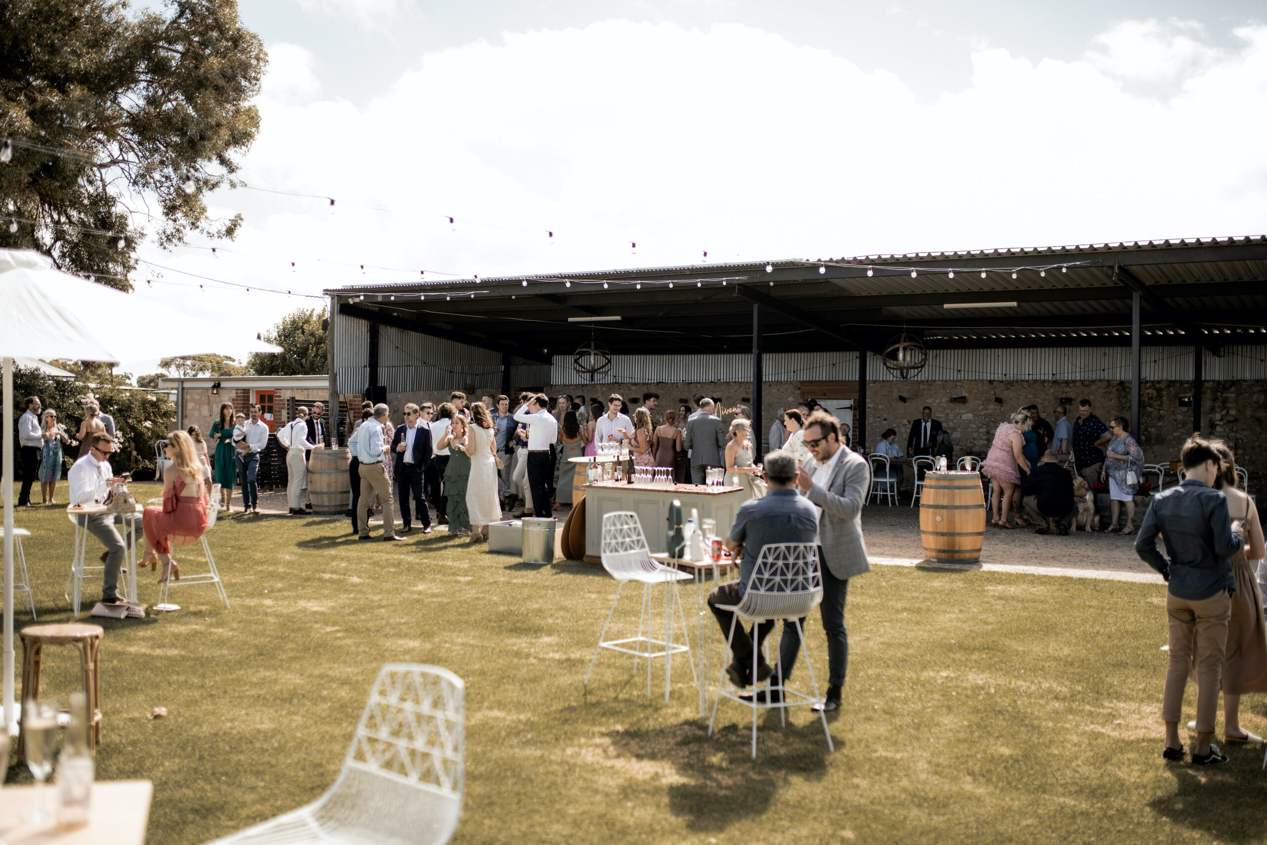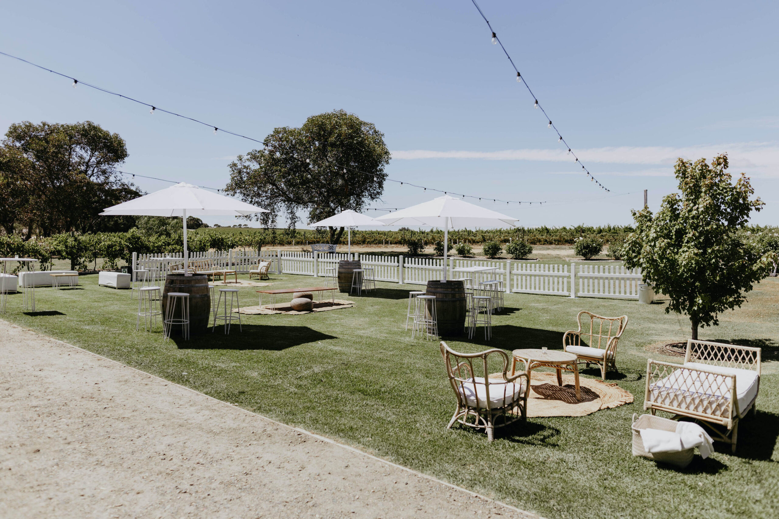 The most important space though, is that reserved for receptions, The Barn. Closed on three sides with stone walls and protected by a high ceiling it’s a space large enough to accommodate 110 guests for a seated reception and opens out to a large lawn area adjacent to the vines which increases its capacity in fine weather (up to 300 guests for a cocktail celebration). Roll in a food truck or wood fired pizza ovens, comfy lounge furniture or lawn games and a couple of strings of festoon lights. It’s a picture of laid back country wedding perfection.