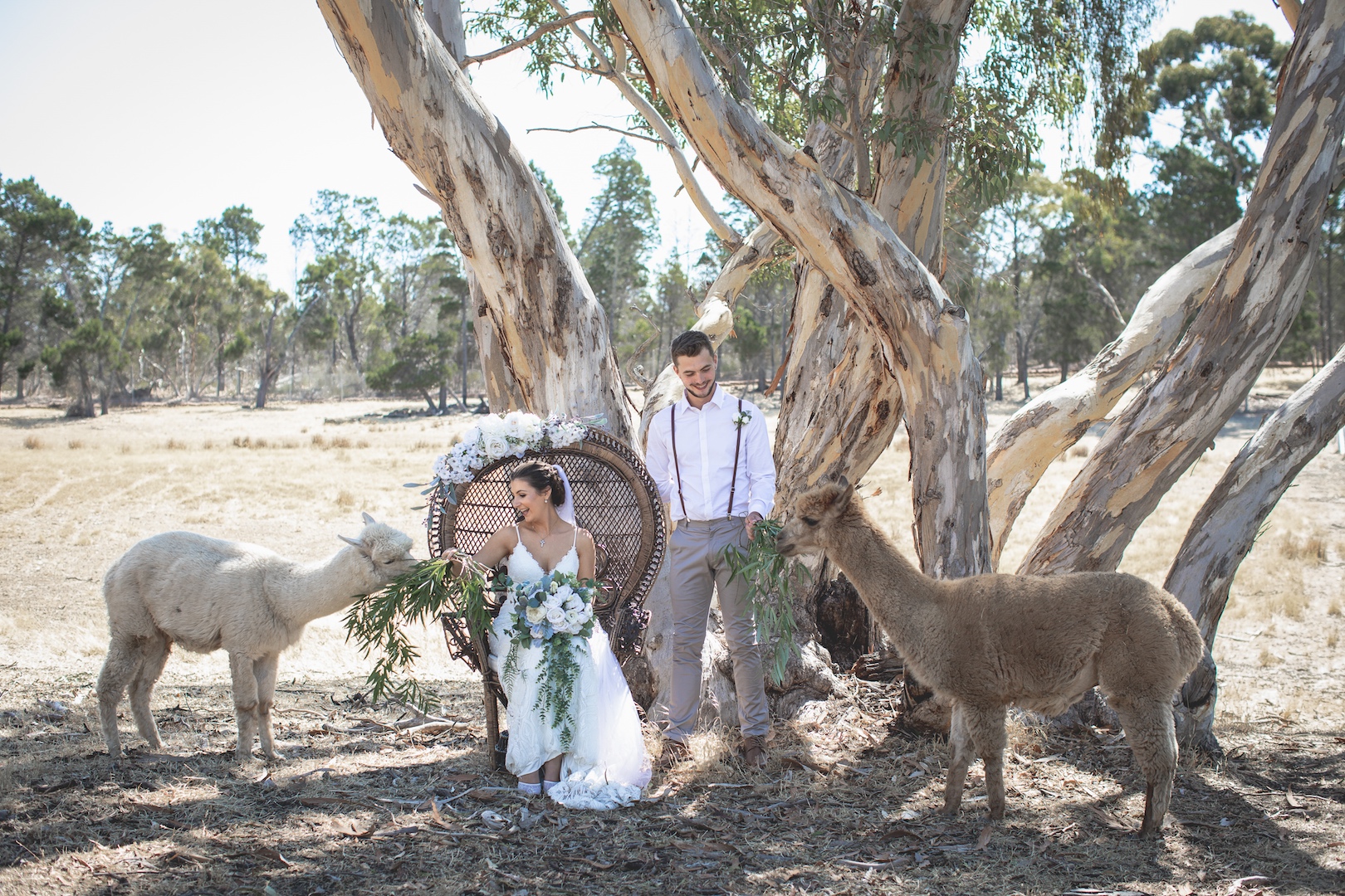 The property at large offers couples an incredible variety of locations for their photo tour. Wander a little away from the garden and you will find paddocks with photogenic and willing alpacas, and sheep grazing amongst native pines and gum trees.