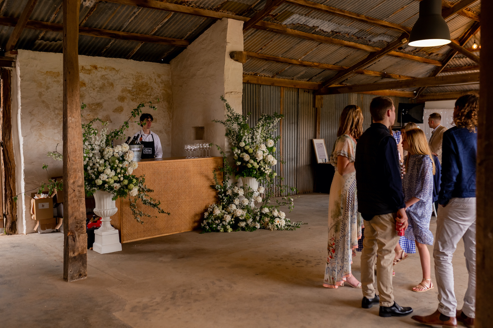 The centrepiece of Stoney Creek Estate is an original stone barn, which was crafted out of stone sourced from the creek running through the property. Once a dusty storage space for farm equipment, the barn has undergone a beautiful restoration using character reclaimed timber windows, and featuring white-washed walls, rustic roof beams, concrete flooring, and a large corrugated sliding door. This space has a genuinely rustic feel but is warm and inviting, as it has the added benefit of lighting, heating and cooling throughout, as well as plumbed bathrooms. A stunning all-weather option for your reception, we can see this space used for both formal seated receptions or more casual affairs, especially if the weather isn’t ideal.