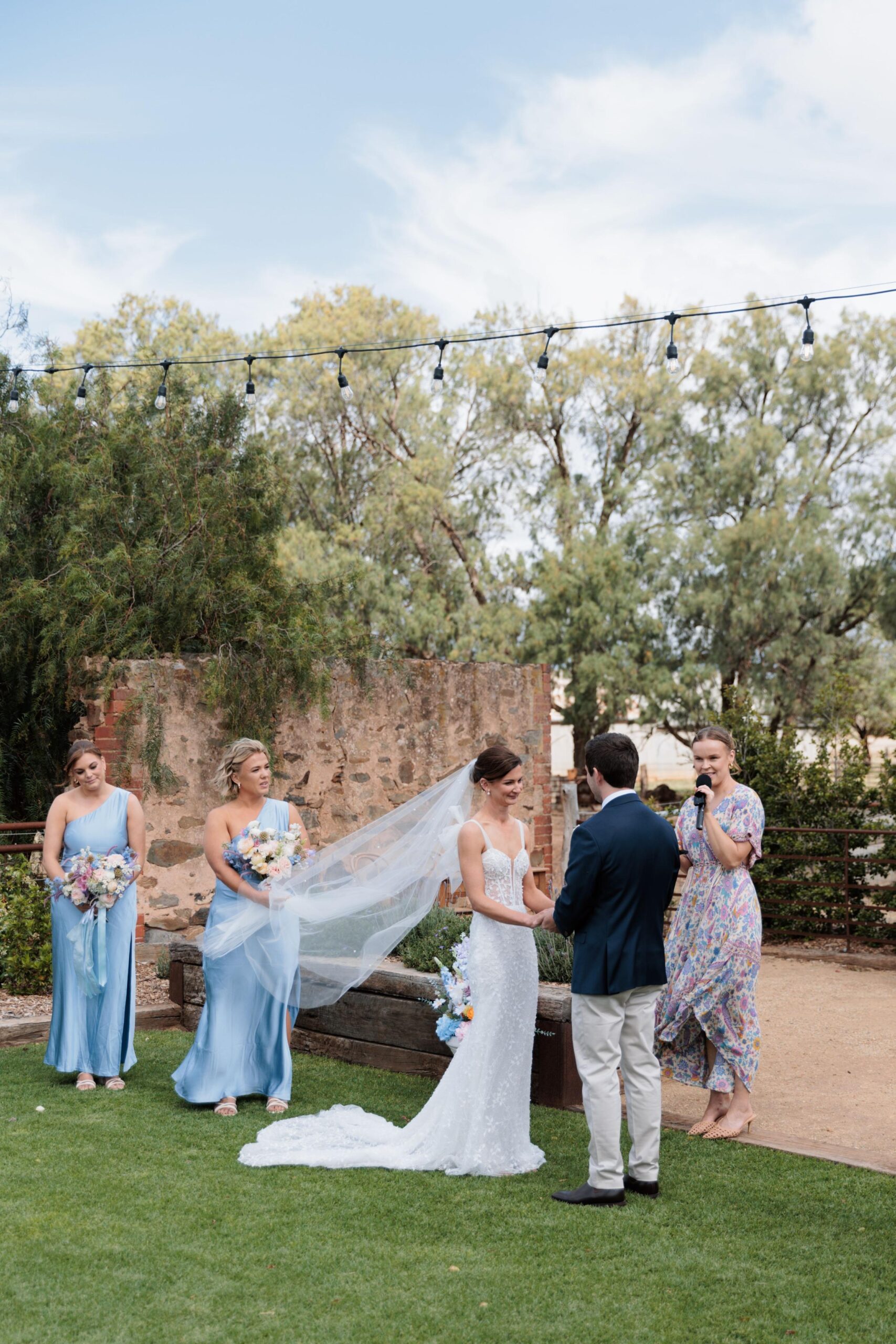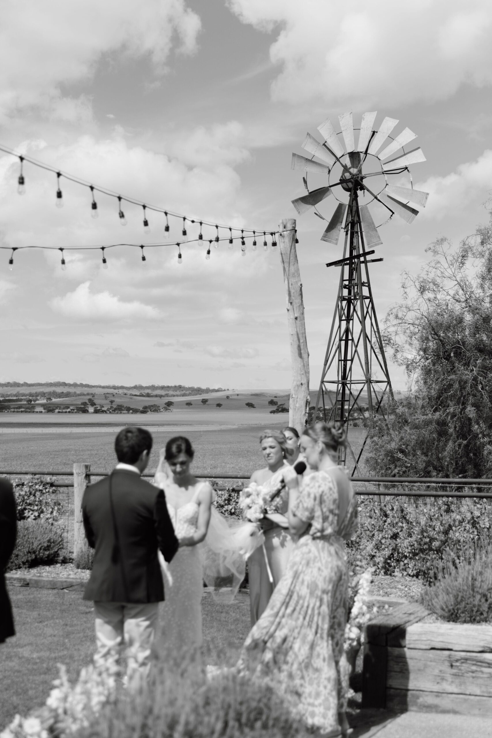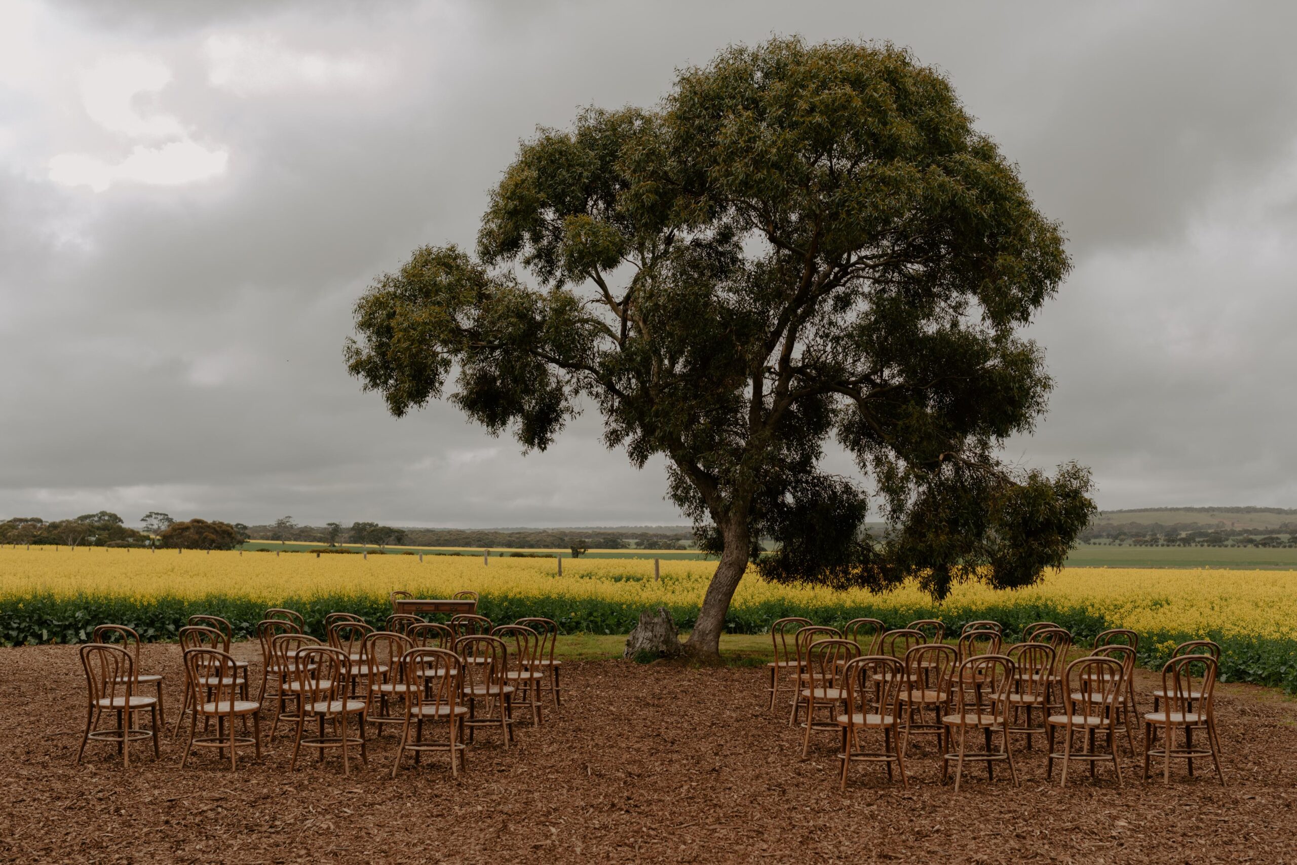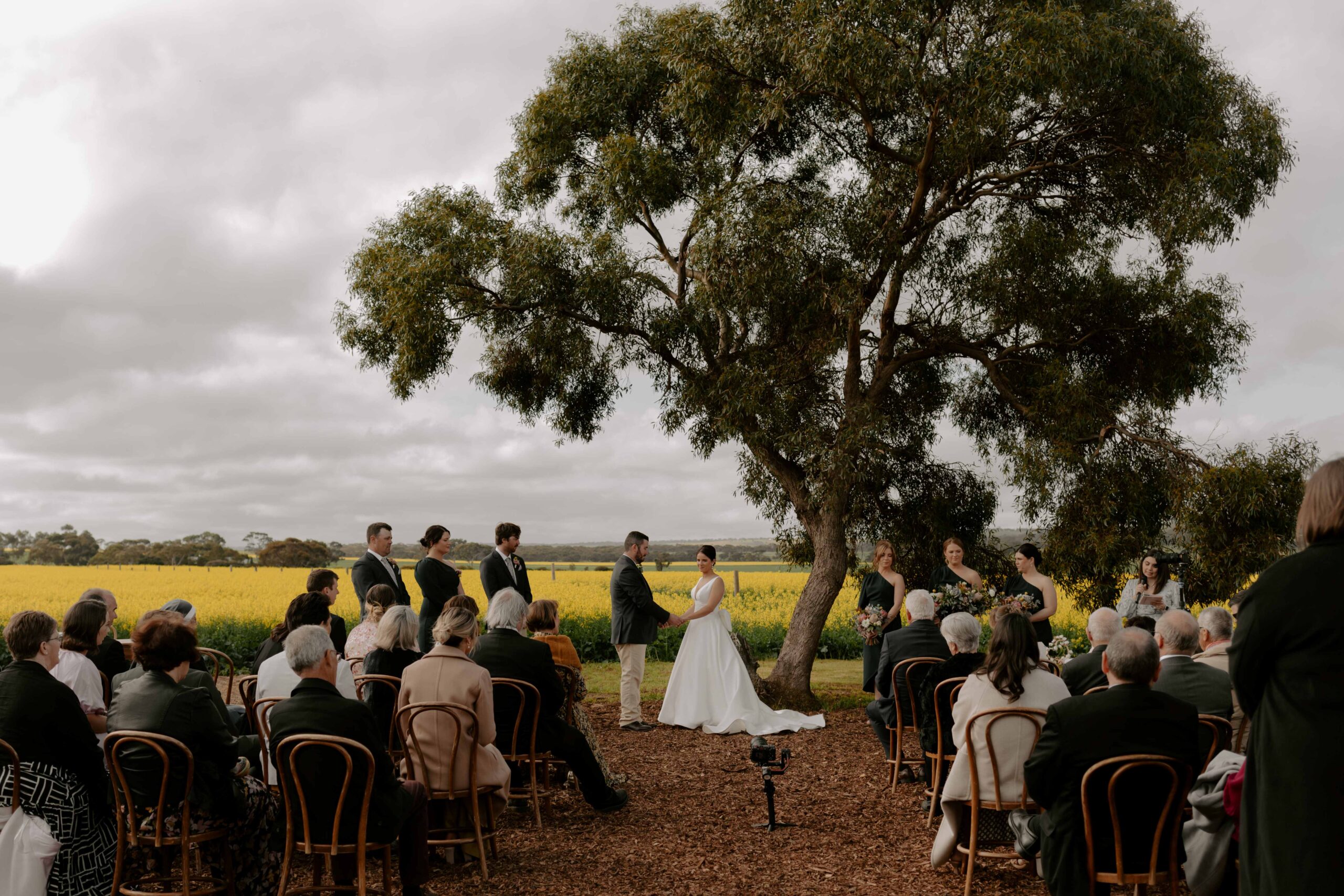 There are two main ceremony locations at Thiele Vale. Exchange vows beneath a statement gum tree or within the lush Homestead Gardens, each space offers views of their expansive rural backdrop (sometimes complete with rows of crops), allowing you to shape a ceremony that feels relaxed and unmistakably country. The great thing about both of these spaces is that your ceremony can flow seamlessly into pre-dinners without any fuss or long walks.