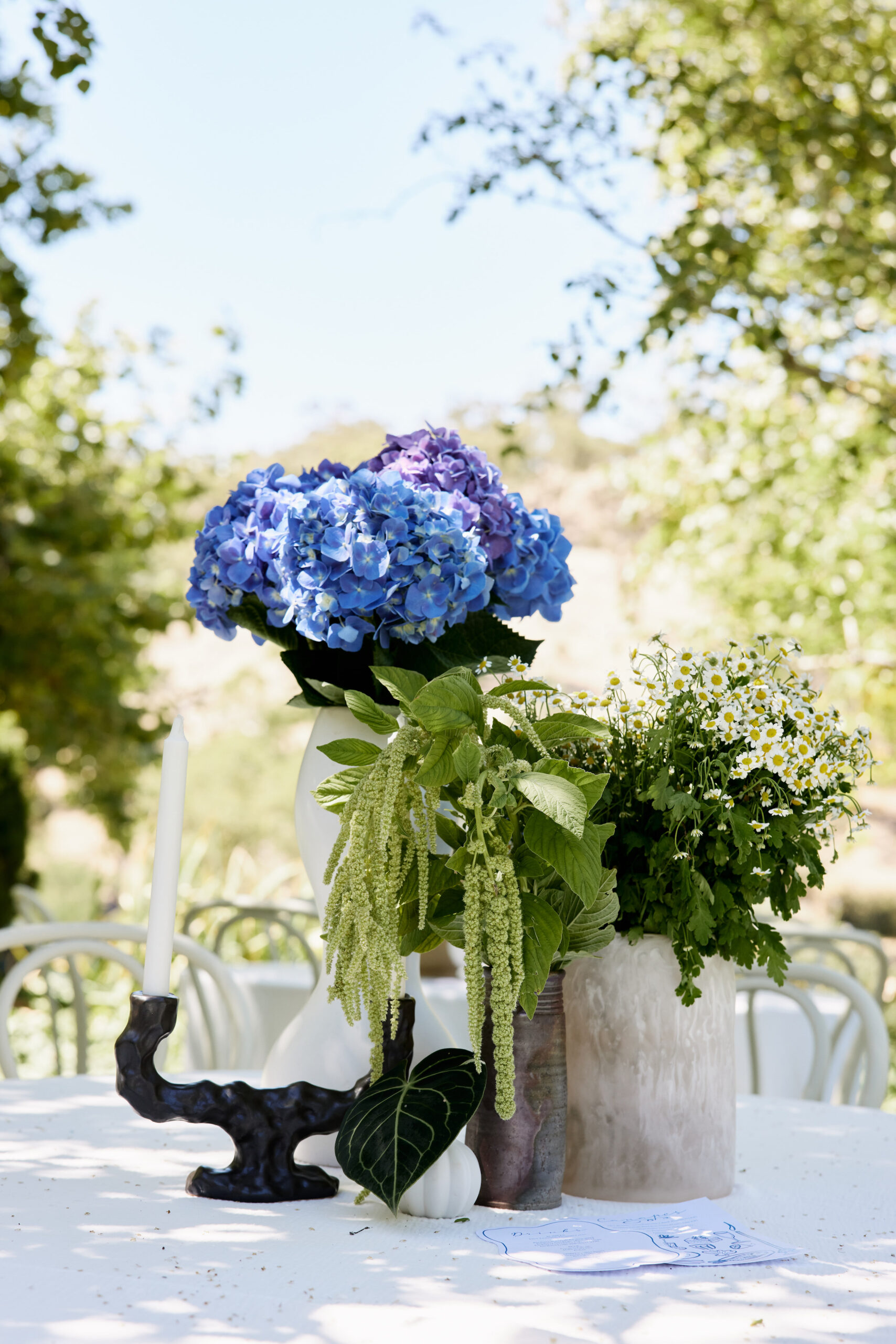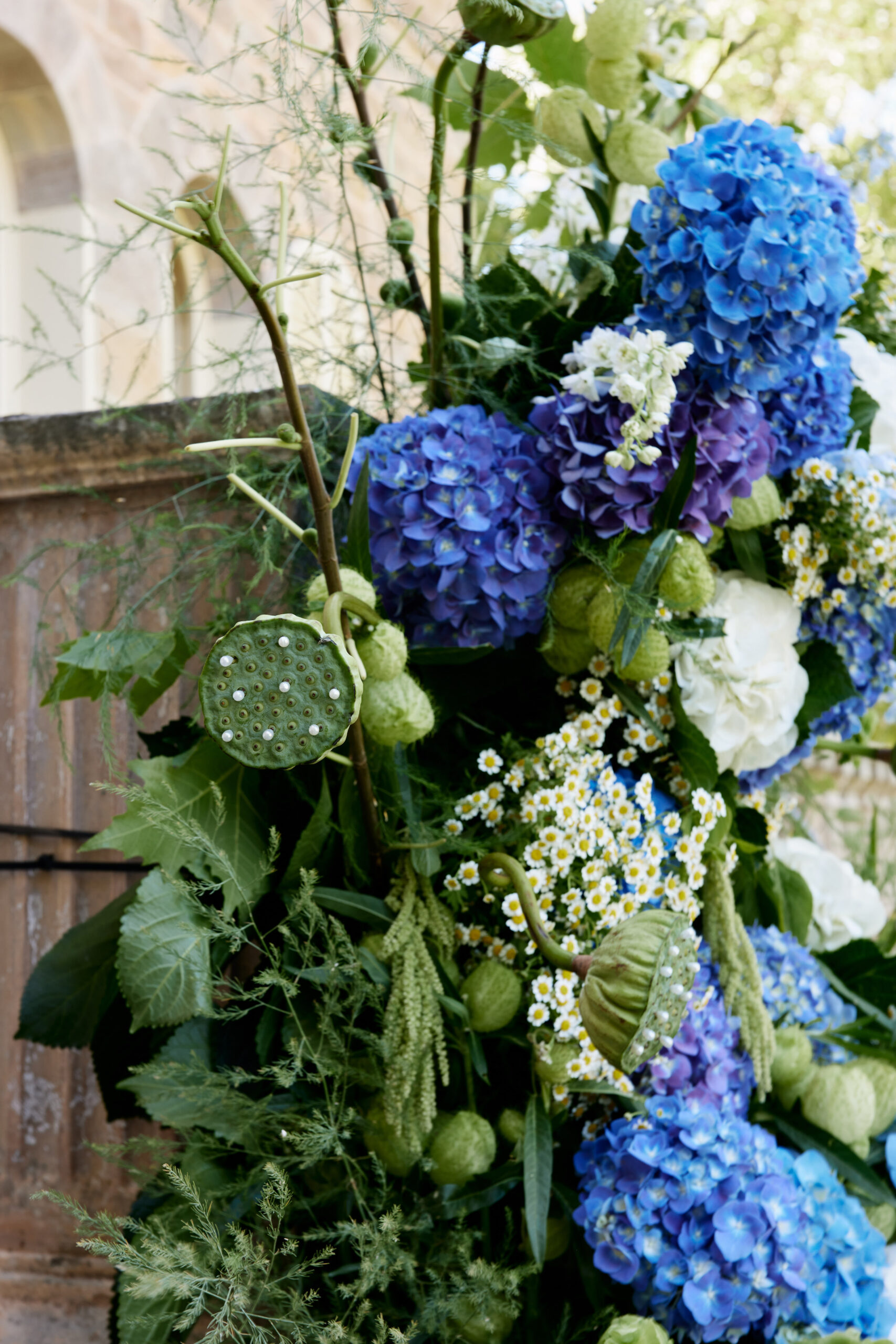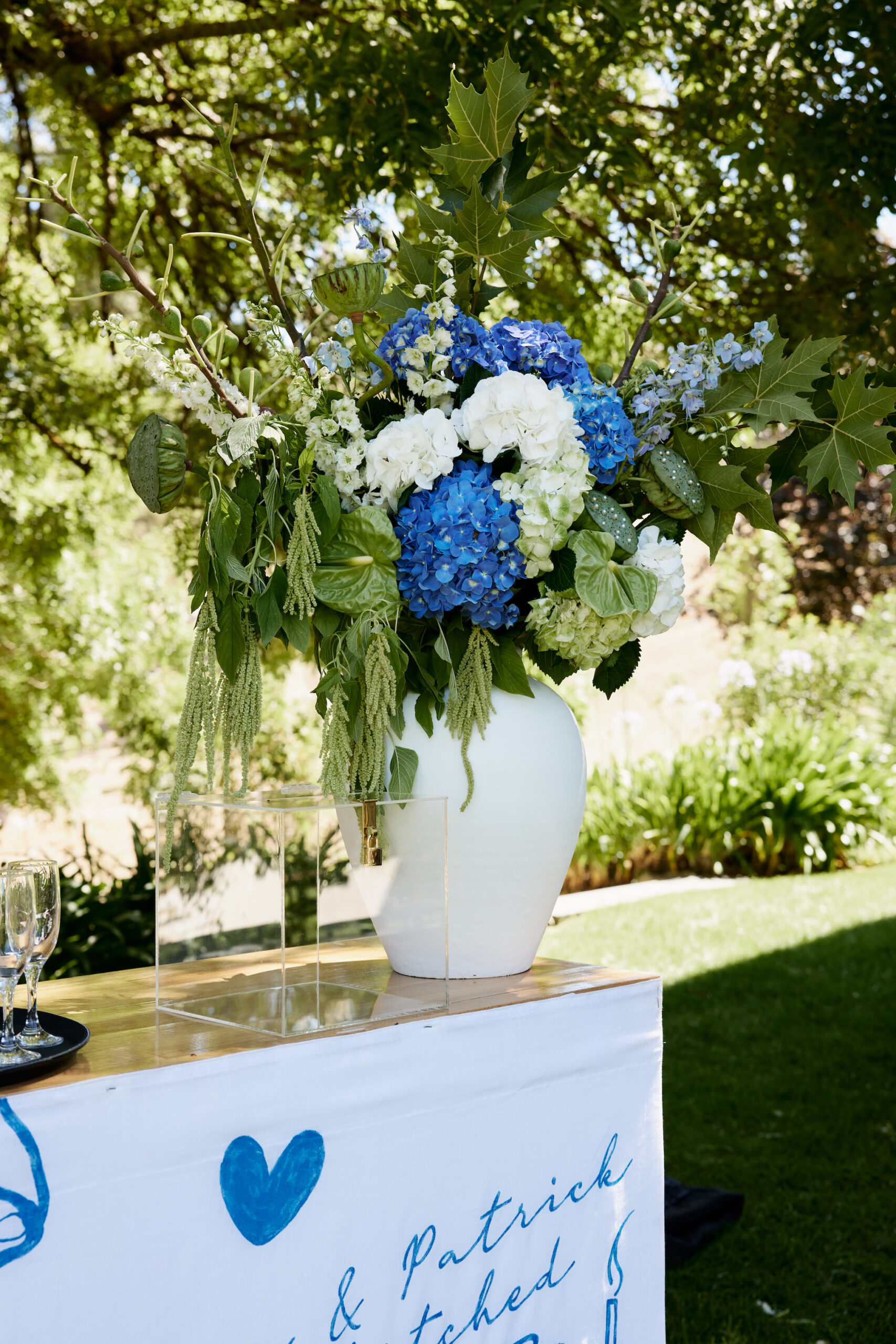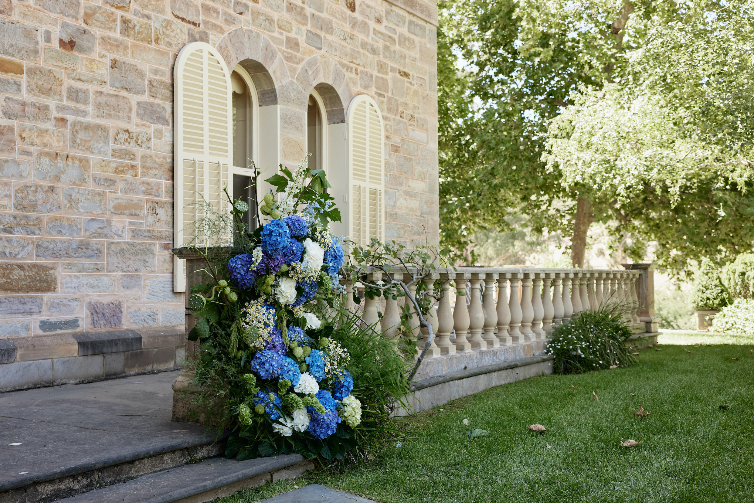 Their choice of florals by Shack Flowers featured a palette of blues (of course) and greens for the aisle installation and round table centrepieces, including a stunning variety of hydrangeas, and pinks for the cake decoration and long table centrepieces.